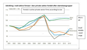 Therefore, it is very problematic that Danish SMEs do not grow or create new jobs. In the ten years 2004-13 their growth was slower than that of the few large ones. SMEs have thus lost share of total turnover. The number of employees has decreased by 2.4 percent, revenue per employee has decreased, too, and they have fewer employees per SME. Danish SMEs are inferior to those in our neighboring countries in exploiting growth potentials, and to convert new technologies into productivity and value.